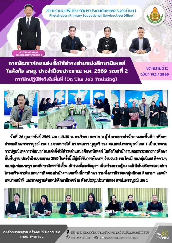การพัฒนาก่อนแต่งตั้งให้ดำรงตำแหน่งศึกษานิเทศก์ในสังกัด สพฐ. ประจำปีงบประมาณ พ.ศ. 2569 ระยะที่ 2 การฝึกปฏิบัติในพื้นที่ (On The Jop Training)By pinsherfa_dlct / February 26, 2026 Post Views: 15