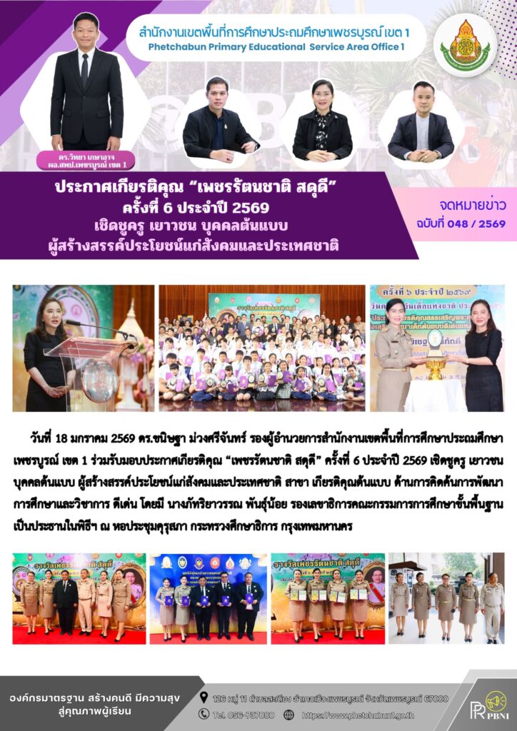 ประกาศเกียรติคุณ “เพชรรัตนชาติ สดุดี” ครั้งที่ 6 ประจำปี 2569 เชิดชูครู เยาวชน บุคคลต้นแบบ ผู้สร้างสรรค์ประโยชน์แก่สังคมและประเทศชาติBy pinsherfa_dlct / January 18, 2026 Post Views: 2