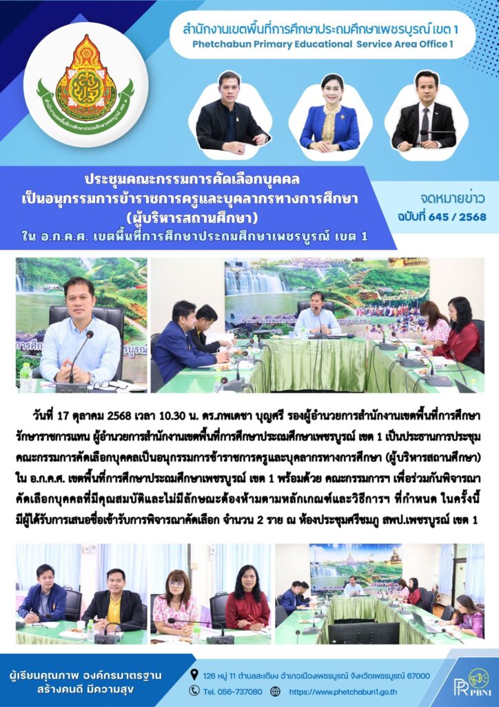 ประชุมคณะกรรมการคัดเลือกบุคคลเป็นอนุกรรมการข้าราชการครูและบุคลากรทางการศึกษา (ผู้บริหารสถานศึกษา) ใน อ.ก.ค.ศ. เขตพื้นที่การศึกษาประถมศึกษาเพชรบูรณ์ เขต 1