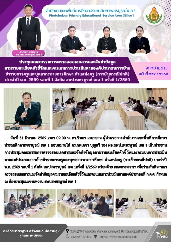 ประชุมคณะกรรมการตรวจสอบเอกสารและจัดทำข้อมูลตามรายละเอียดตัวชี้วัดและคะแนนประเมินตามองค์ประกอบการย้ายข้าราชการครูและบุคลากรทางการศึกษา ตำแหน่งครู (การย้ายกรณีปกติ) ประจำปี พ.ศ. 2569 รอบที่ 1