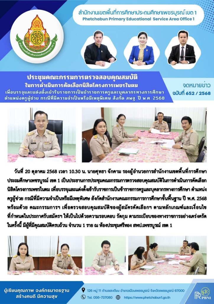 ประชุมคณะกรรมการตรวจสอบคุณสมบัติในการดำเนินการคัดเลือกนิสิตโครงการเพชรในตม เพื่อบรรจุและแต่งตั้งเข้ารับราชการเป็นข้าราชการครูและบุคลากรทางการศึกษา ตำแหน่งครูผู้ช่วย กรณีที่มีความจำเป็นหรือมีเหตุพิเศษ สังกัด สพฐ. ปี พ.ศ. 2568