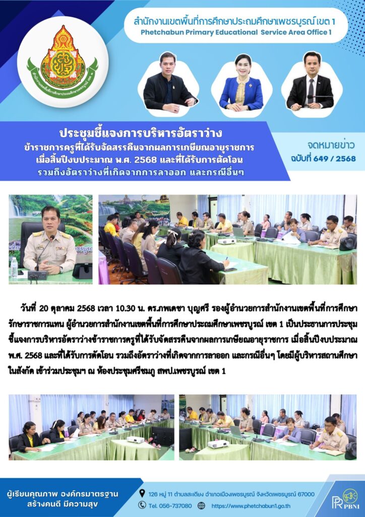 ประชุมชี้แจงการบริหารอัตราว่าง ข้าราชการครูที่ได้รับจัดสรรคืนจากผลการเกษียณอายุราชการ เมื่อสิ้นปีงบประมาณ พ.ศ. 2568 และที่ได้รับการตัดโอน รวมถึงอัตราว่างที่เกิดจากการลาออก และกรณีอื่นๆ