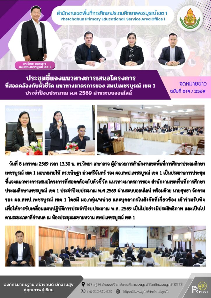 ประชุมชี้แจงแนวทางการเสนอโครงการที่สอดคล้องกับตัวชี้วัด แนวทางมาตรการของ สพป.เพชรบูรณ์ เขต 1 ประจำปีงบประมาณ พ.ศ. 2569By pinsherfa_dlct / January 8, 2026 Post Views: 1