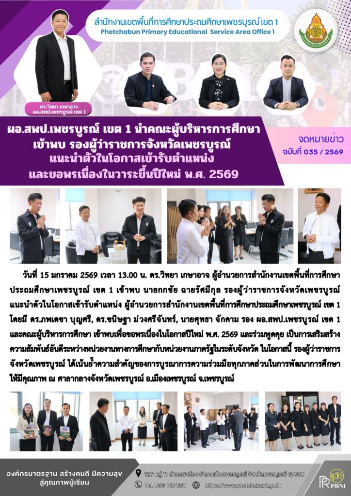 ผอ.สพป.เพชรบูรณ์ เขต 1 นำคณะผู้บริหารการศึกษาเข้าพบ รองผู้ว่าราชการจังหวัดเพชรบูรณ์ แนะนำตัวในโอกาสเข้ารับตำแหน่ง และขอพรเนื่องในวาระขึ้นปีใหม่By pinsherfa_dlct / January 15, 2026 Post Views: 1
