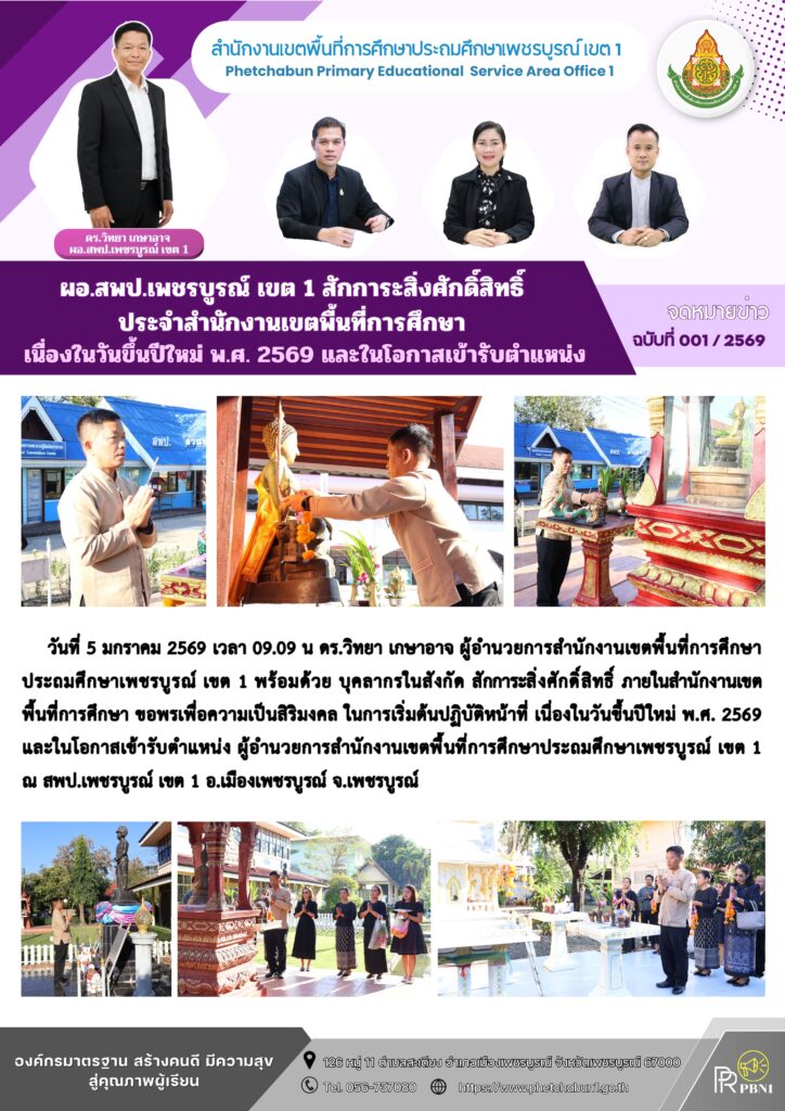 ผอ.สพป.เพชรบูรณ์ เขต 1 สักการะสิ่งศักดิ์สิทธิ์ประจำสำนักงานเขตพื้นที่การศึกษา เนื่องในวันขึ้นปีใหม่ พ.ศ. 2569 และในโอกาสเข้ารับตำแหน่งBy pinsherfa_dlct / January 5, 2026 Post Views: 6