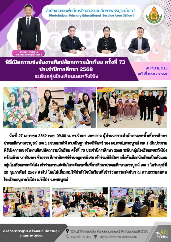 พิธีเปิดการแข่งขันงานศิลปหัตถกรรมนักเรียน ครั้งที่ 73 ประจำปีการศึกษา 2568 ระดับกลุ่มโรงเรียนเพชรวังโป่งBy pinsherfa_dlct / January 27, 2026 Post Views: 2