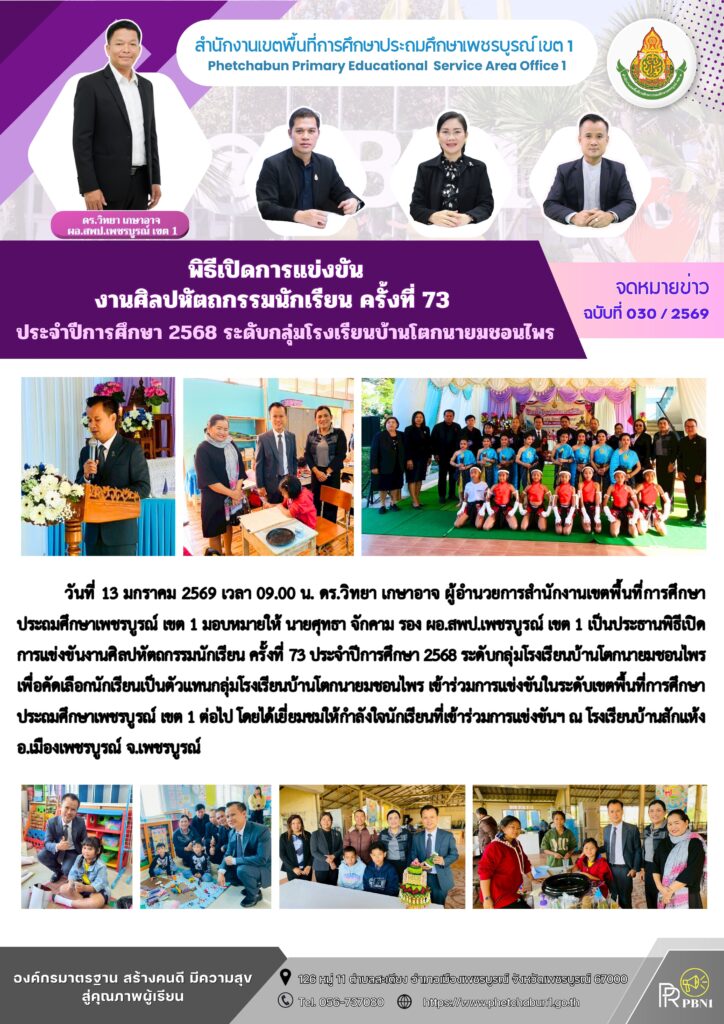 พิธีเปิดการแข่งขันงานศิลปหัตถกรรมนักเรียน ครั้งที่ 73 ประจำปีการศึกษา 2568 ระดับกลุ่มโรงเรียนบ้านโตกนายมชอนไพรBy pinsherfa_dlct / January 13, 2026 Post Views: 2