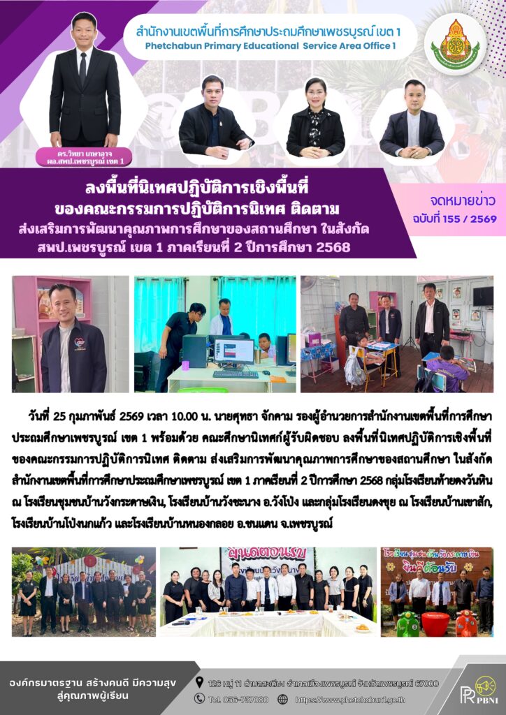 ลงพื้นที่นิเทศปฏิบัติการเชิงพื้นที่ของคณะกรรมการปฏิบัติการนิเทศ ติดตาม ส่งเสร้มการพัฒนาคุณภาพการศึกษาของสถานศึกษา ในสังกัด สพป.เพชรบูรณ์ เขต 1 ภาคเรียนที่ 2 ปีการศึกษา 2568By pinsherfa_dlct / February 25, 2026 Post Views: 13