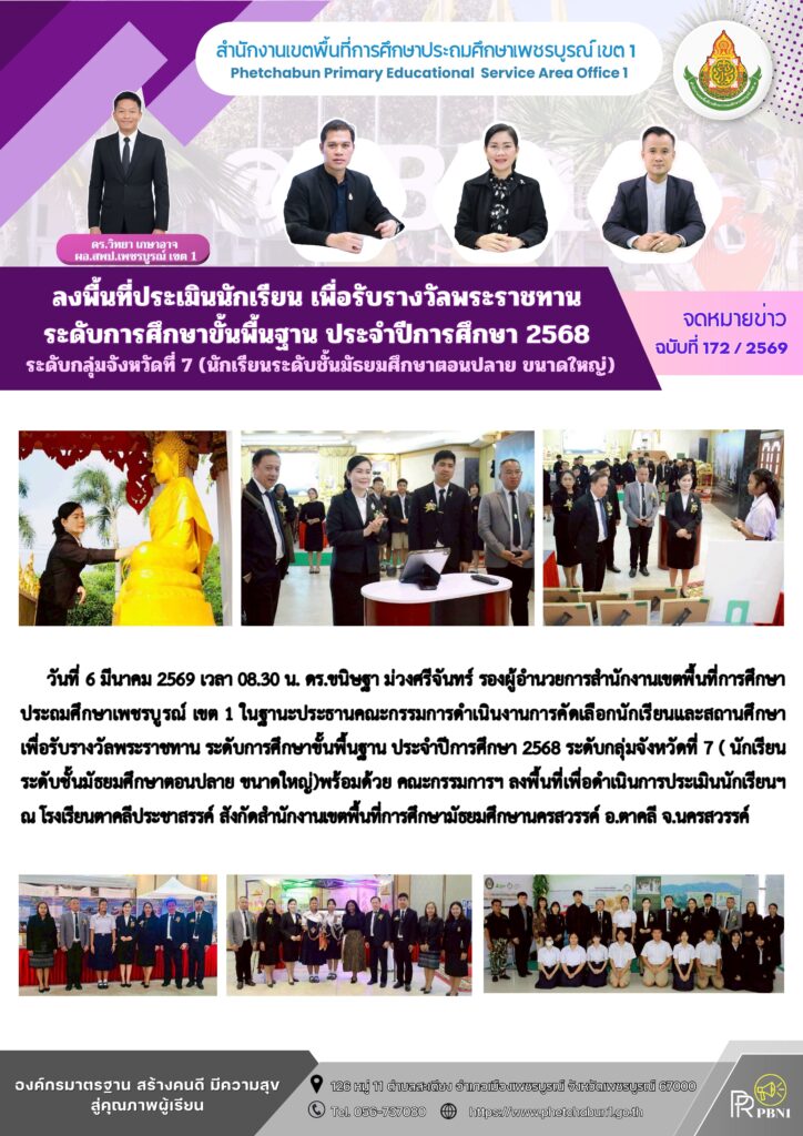 ลงพื้นที่ประเมินนักเรียน เพื่อรับรางวัลพระราชทาน ระดับการศึกษาขั้นพื้นฐาน ประจำปีการศึกษา 2568 ระดับกลุ่มจังหวัดที่ 7 (นักเรียนระดับชั้นมัธยมศึกษาตอนปลาย ขนาดใหญ่)