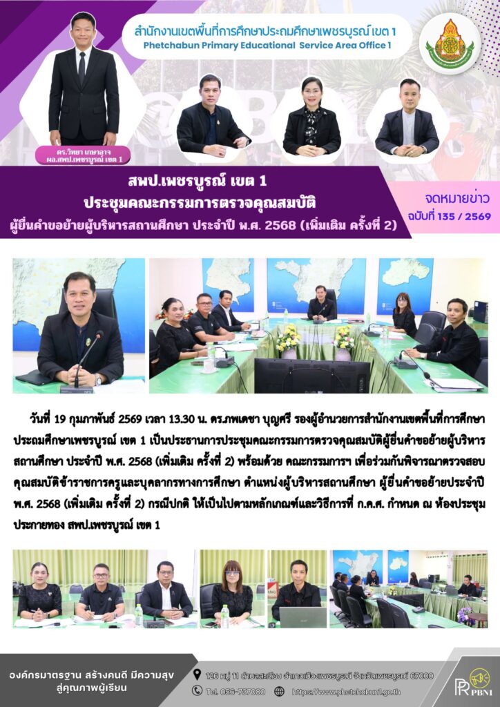 สพป.เพชรบูรณ์ เขต 1ประชุมคณะกรรมการตรวจคุณสมบัติผู้ยื่นคำขอย้ายผู้บริหารสถานศึกษา ประจำปี พ.ศ. 2568 (เพิ่มเติม ครั้งที่ 2)By pinsherfa_dlct / February 19, 2026 Post Views: 1