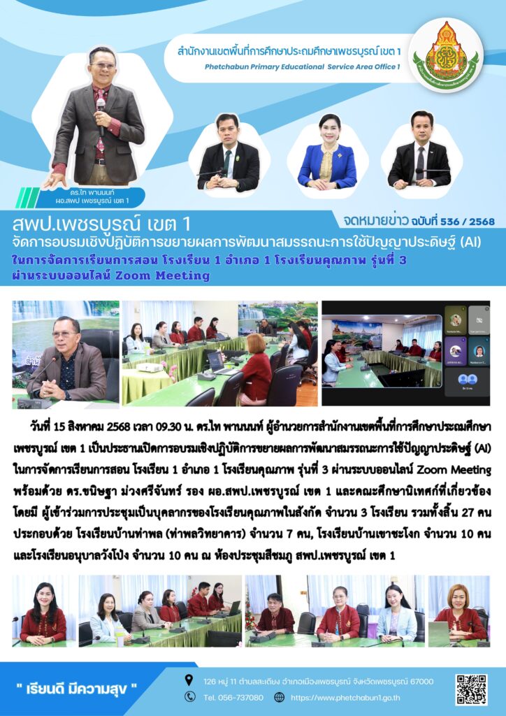 สพป.เพชรบูรณ์ เขต 1 จัดการอบรมเชิงปฏิบัติการขยายผลการพัฒนาสมรรถนะการใช้ปัญญาประดิษฐ์ (AI) ในการจัดการเรียนการสอน 1 อำเภอ 1 โรงเรียนคุณภาพ รุ่นที่ 3By pinsherfa_dlct / August 15, 2025 Post Views: 48