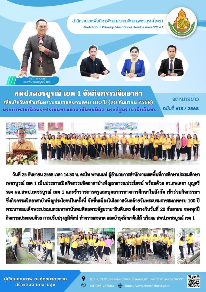 สพป.เพชรบูรณ์ เขต 1 จัดกิจกรรมจิตอาสา เนื่องในวันคล้ายวันพระบรมราชสมภพครบ 100 ปี (20 กันยายน 2568) พระบามสมเด็จพระปรเมนทรมหาอานันทมหิดล พระอัฐมราธิบดินทรBy pinsherfa_dlct / September 25, 2025 Post Views: 10