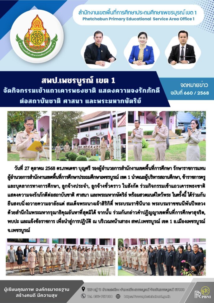 สพป.เพชรบูรณ์ เขต 1 จัดกิจกรรมเข้าแถวเคารพธงชาติ แสดงความจงรักภักดีต่อสถาบันชาติ ศาสนา และพระมหากษัตริย์By pinsherfa_dlct / October 27, 2025 Post Views: 1