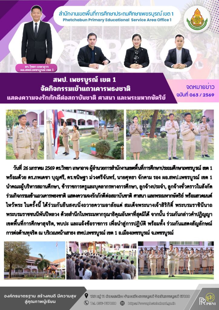 สพป.เพชรบูรณ์ เขต 1 จัดกิจกรรมเข้าแถวเคารพธงชาติ แสดงความจงรักภักดีต่อสถาบัน ชาติ ศาสนา และพระมหากษัตริย์By pinsherfa_dlct / January 26, 2026 Post Views: 2