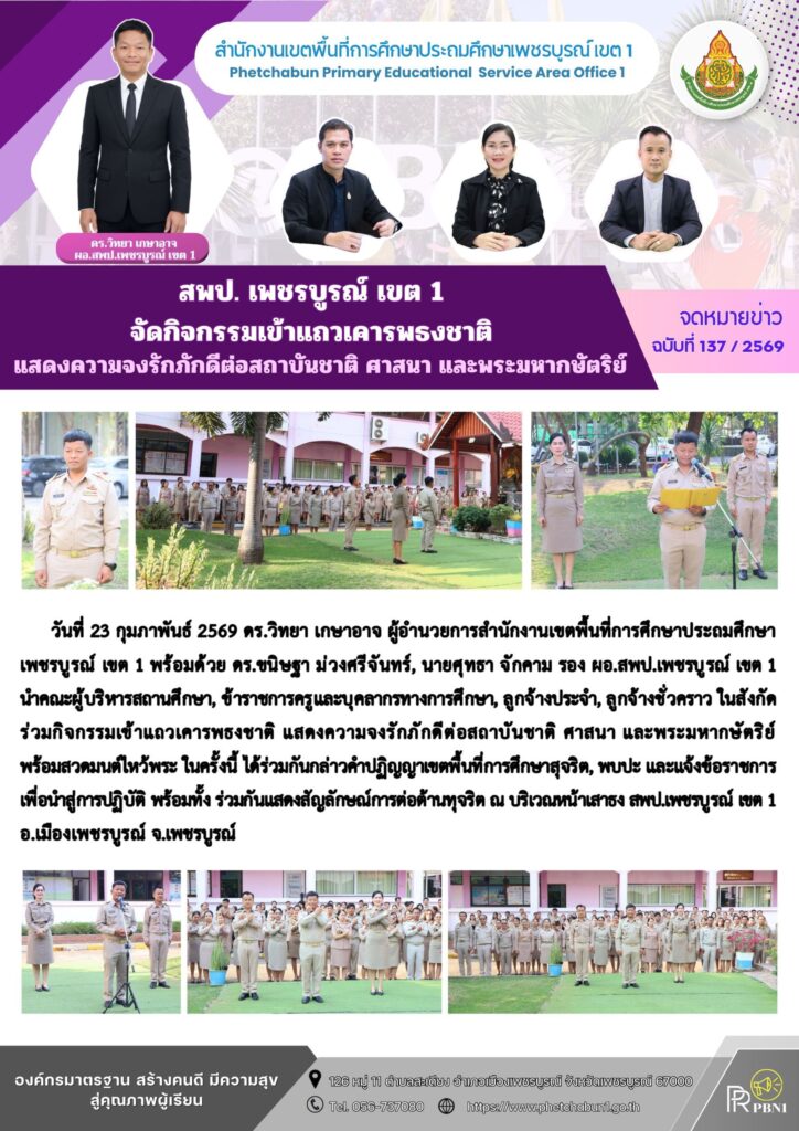 สพป.เพชรบูรณ์ เขต 1 จัดกิจกรรมเข้าแถวเคารพธงชาติ แสดงความจงรักภักดีต่อสถาบันชาติ ศาสนา และพระมหากษัตริย์By pinsherfa_dlct / February 23, 2026 Post Views: 1
