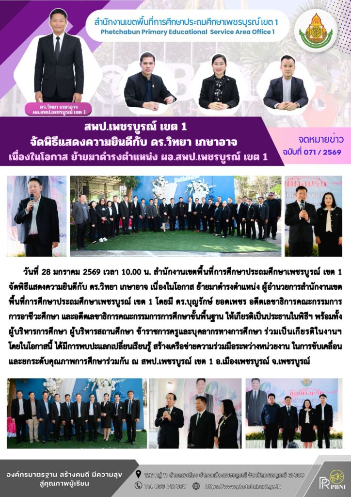 สพป.เพชรบูรณ์ เขต 1 จัดพิธีแสดงความยินดีกับ ดร.วิทยา เกษาอาจ เนื่องในโอกาส ย้ายมาดำรงตำแหน่ง ผอ.สพป.เพชรบูรณ์ เขต 1By pinsherfa_dlct / January 28, 2026 Post Views: 1
