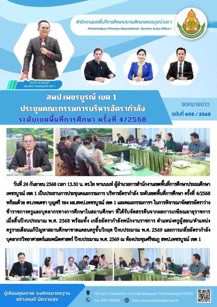 สพป.เพชรบูรณ์ เขต 1 ประชุมคณะกรรมการบริหารอัตรากำลัง ระดับเขตพื้นที่การศึกษา ครั้งที่ 4/2568By pinsherfa_dlct / September 24, 2025 Post Views: 9