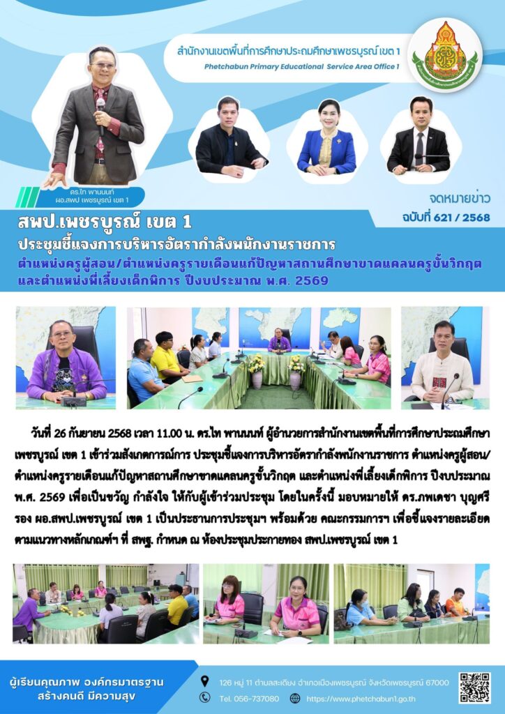 สพป.เพชรบูรณ์ เขต 1 ประชุมชี้แจงการบริหารอัตรากำลังพนักงานราชการ ตำแหน่งครูผู้สอน/ตำแหน่งครูรายเดือนแก้ปัญหาสถานศึกษาขาดแคลนครูขั้นวิกฤต และตำแหน่งพี่เลี้ยงเด็กพิการ ปีงบประมาณ พ.ศ. 2569By pinsherfa_dlct / September 26, 2025 Post Views: 4