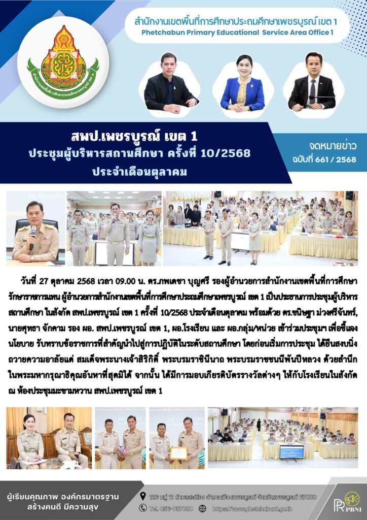 สพป.เพชรบูรณ์ เขต 1 ประชุมผู้บริหารสถานศึกษา ครั้งที่ 10/2568 ประจำเดือนตุลาคมBy pinsherfa_dlct / October 27, 2025 Post Views: 1