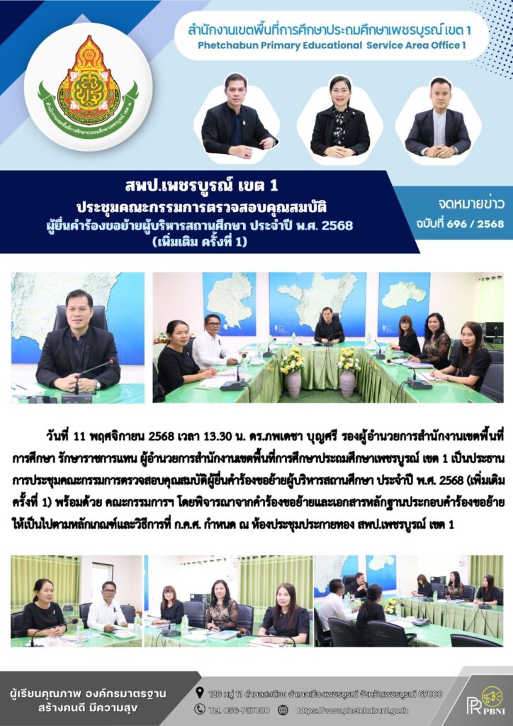 สพป.เพชรบูรณ์ เขต 1 ประชุมคณะกรรมการตรวจสอบคุณสมบัติผู้ยื่นคำร้องขอย้ายผู้บริหารสถานศึกษา ประจำปี พ.ศ. 2568 (เพิ่มเติม ครั้งที่ 1)By pinsherfa_dlct / November 11, 2025 Post Views: 1