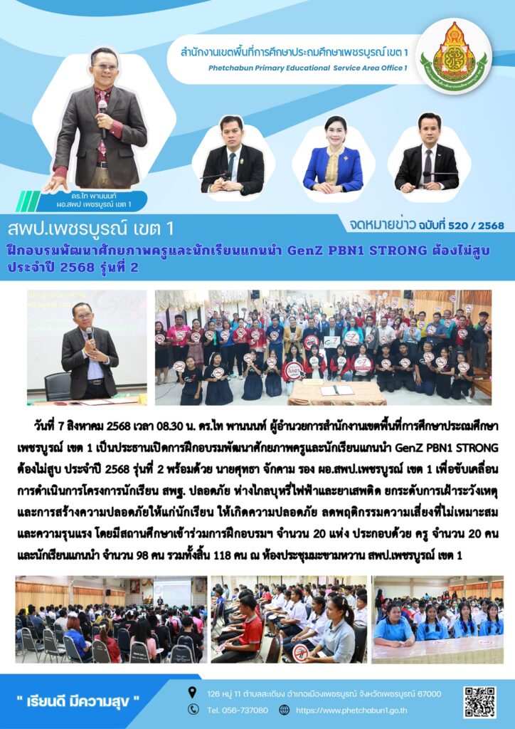 สพป.เพชรบูรณ์ เขต 1 ฝึกอบรมพัฒนาศักยภาพครูและนักเรียนแกนนำ GenZ PBN1 STRONG ต้องไม่สูบ ประจำปี 2568 รุ่นที่ 2By pinsherfa_dlct / August 7, 2025 Post Views: 58