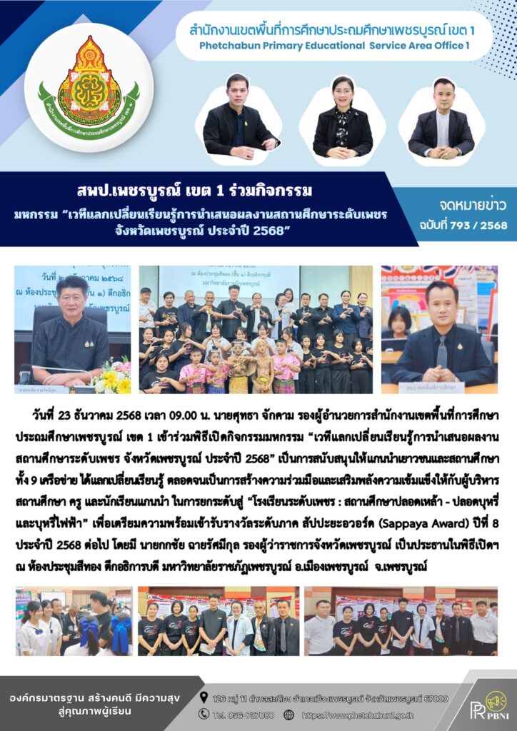 สพป.เพชรบูรณ์ เขต 1 มหกรรม “เวทีแลกเปลี่ยนเรียนรู้การนำเสนอผลงานสถานศึกษาระดับเพชร จังหวัดเพชรบูรณ์ ประจำปี 2568”