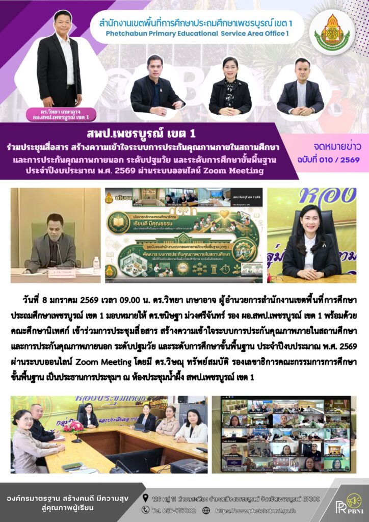 สพป.เพชรบูรณ์ เขต 1 ร่วมประชุมสื่อสาร สร้างความเข้าใจระบบการประกันคุณภาพภายในสถานศึกษา และการประกันคุณภาพภายนอก ระดับปฐมวัย และระดับการศึกษาขั้นพื้นฐาน ประจำปีงบประมาณ พ.ศ. 2569By pinsherfa_dlct / January 8, 2026 Post Views: 1