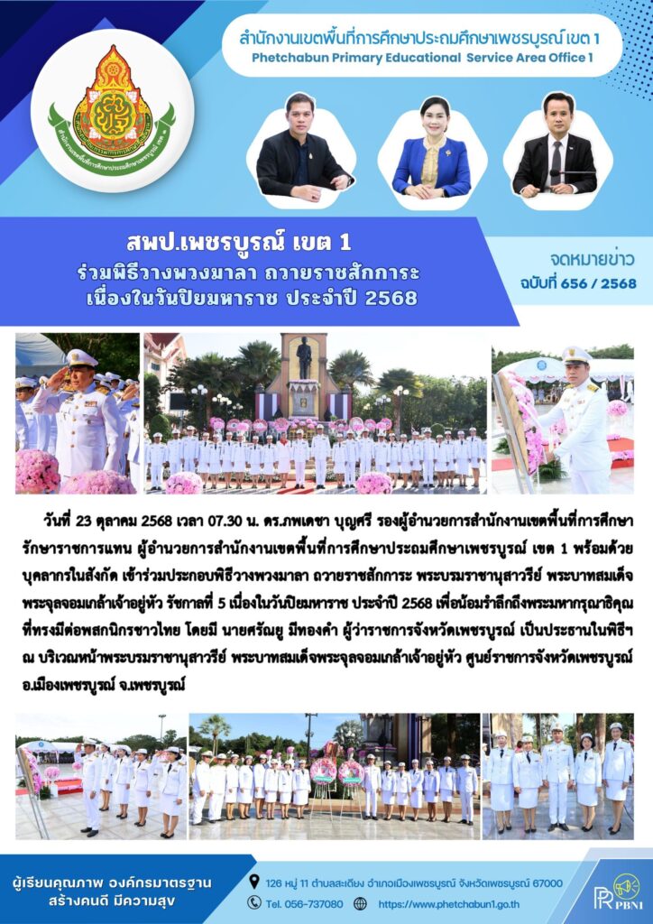 สพป.เพชรบูรณ์ เขต 1 ร่วมพิธีวางพวงมาลา ถวายราชสักการะ เนื่องในวันปิยมหาราช ประจำปี 2568By pinsherfa_dlct / October 23, 2025 Post Views: 1