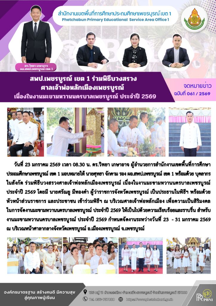 สพป.เพชรบูรณ์ เขต 1 ร่วมพิธีบวงสรวงศาลเจ้าพ่อหลักเมืองเพชรบูรณ์ เนื่องในงานมะขามหวานนครบาลเพชรบูรณ์ ประจำปี 2569By pinsherfa_dlct / January 23, 2026 Post Views: 2