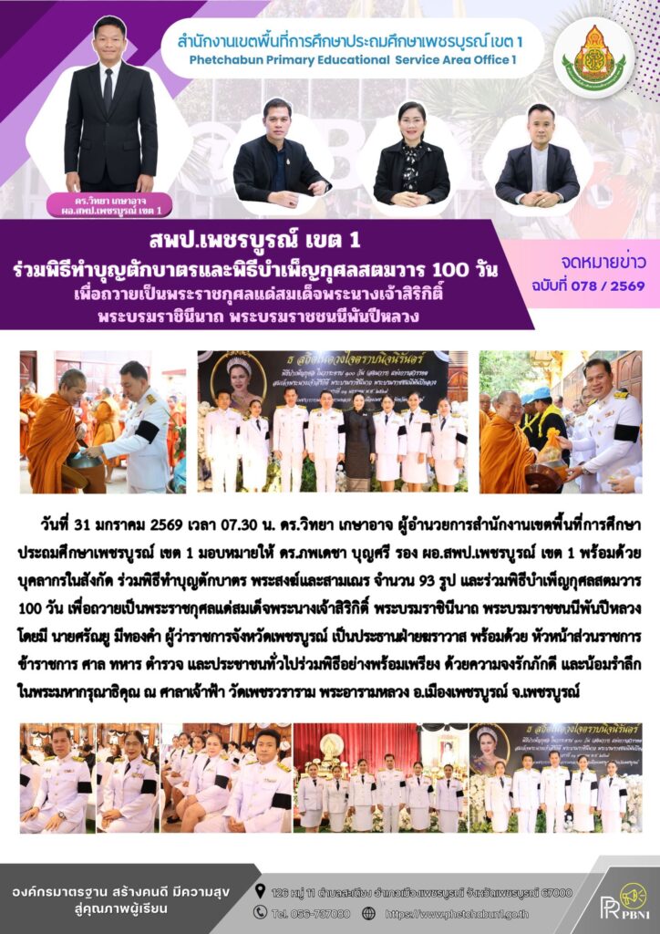 สพป.เพชรบูรณ์ เขต 1 ร่วมพิธีทำบุญตักบาตรและพิธีบำเพ็ญกุศลสตมวาร 100 วัน เพื่อถวายเป็นพระราชกุศลแด่ สมเด็จพระนางเจ้าสิริกิติ์ พระบรมราชินีนาถ พระบรมราชชนนีพันปีหลวง