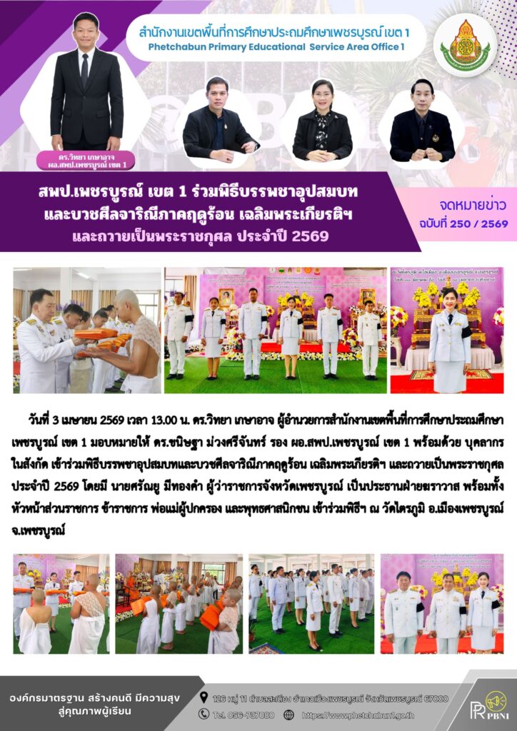 สพป.เพชรบูรณ์ เขต 1 ร่วมพิธีบรรพชาอุปสมบท และบวชศีลจาริณีภาคฤดูร้อน เฉลิมพระเกียรติ และถวายเป็นพระราชกุศล ประจำปี 2569