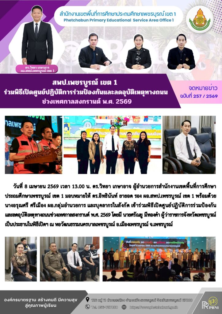 สพป.เพชรบูรณ์ เขต 1 ร่วมพิธีเปิดศูนย์ปฏิบัติการร่วมป้องกันและลดอุบัติเหตุทางถนนช่วงเทศกาลสงกรานต์ พ.ศ. 2569By pinsherfa_dlct / April 8, 2026 Post Views: 2