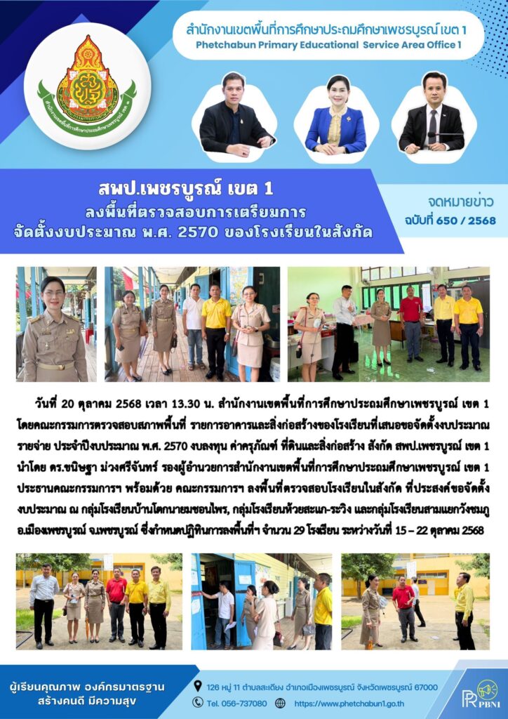 สพป.เพชรบูรณ์ เขต 1 ลงพื้นที่ตรวจสอบการเตรียมการจัดตั้งงบประมาณ พ.ศ. 2570 ของโรงเรียนในสังกัดBy pinsherfa_dlct / October 20, 2025 Post Views: 6