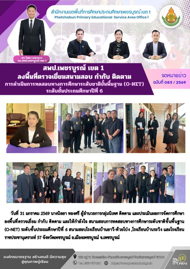 สพป.เพชรบูรณ์ เขต 1 ลงพื้นที่ตรวจเยี่ยมสนามสอบ กำกับ ติดตามการดำเนินการทดสอบทางการศึกษาระดับชาติขั้นพื้นฐาน (O-NET) ระดับชั้นประถมศึกษาปีที่ 6