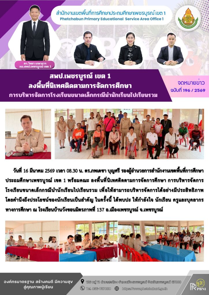 สพป.เพชรบูรณ์ เขต 1 ลงพื้นที่นิเทศติดตามการจัดการศึกษาการบริหารจัดการโรงเรียนขนาดเล็กกรณีนำนักเรียนไปเรียนรวมBy pinsherfa_dlct / March 16, 2026 Post Views: 1