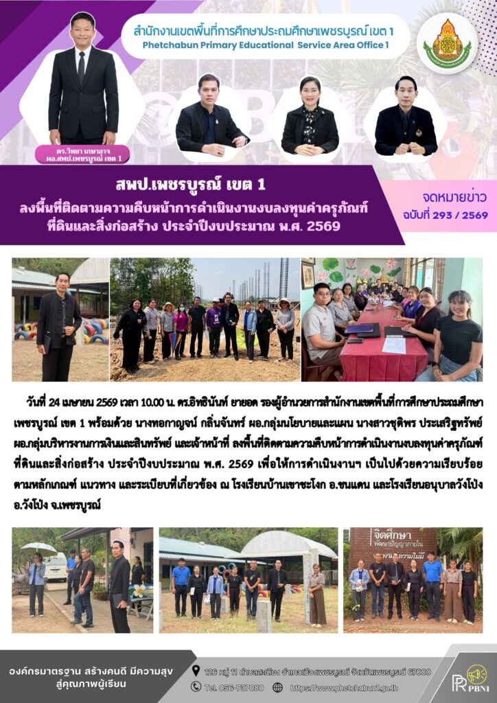 สพป.เพชรบูรณ์ เขต 1 ลงพื้นที่ติดตามความคืบหน้าการดำเนินงานงบลงทุนค่าครุภัณฑ์ที่ดินและสิ่งก่อสร้าง ประจำปีงบประมาณ พ.ศ. 2569By pinsherfa_dlct / April 24, 2026 Post Views: 4