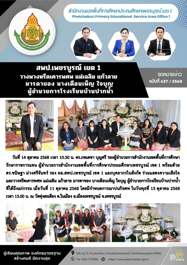 สพป.เพชรบูรณ์ เขต 1 วางพวงหรีดเคารพศพ แม่เฉลิม แก้วลาย มารดาของ นางเดือนเพ็ญ ใจบุญ ผู้อำนวยการโรงเรียนบ้านปากน้ำBy pinsherfa_dlct / October 14, 2025 Post Views: 2
