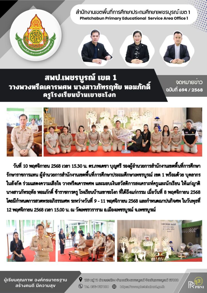 สพป.เพชรบูรณ์ เขต 1 วางพวงหรีดเคารพศพ นางสาวภัทรฤทัย หอมภักดิ์ ครูโรงเรียนบ้านเขาชะโชกBy pinsherfa_dlct / November 10, 2025 Post Views: 1