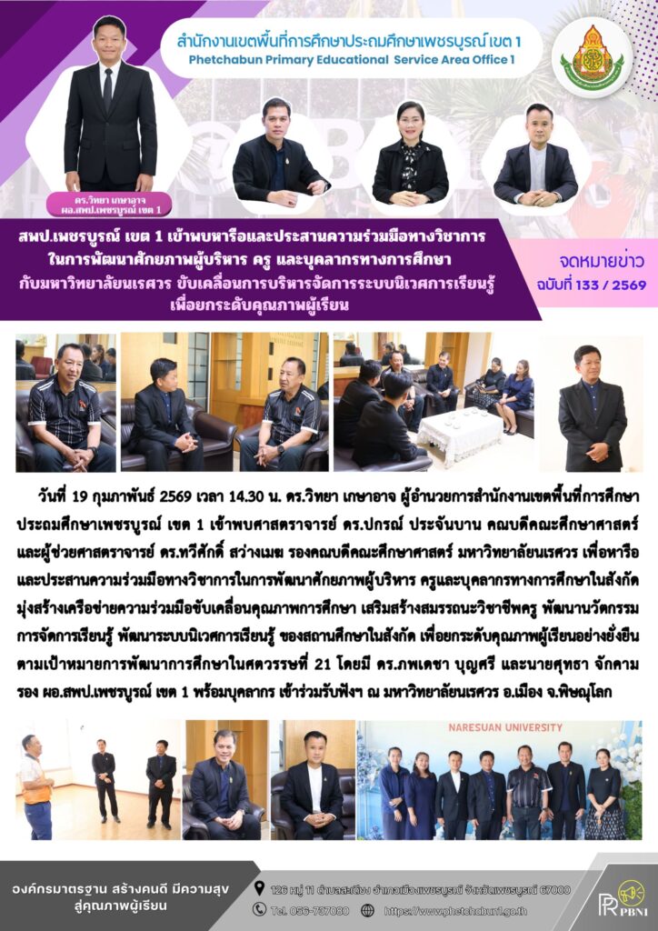 สพป.เพชรบูรณ์ เขต 1 เข้าพบหารือและประสานความร่วมมือทางวิชาการ ในการพัฒนาศักยภาพผู้บริหาร ครู และบุคลากรทางการศึกษากับมหาวิทยาลัยนเรศวร ขับเคลื่อนการบริหารจัดการระบบนิเวศการเรียนรู้เพื่อยกระดับคุณภาพผู้เรียนBy pinsherfa_dlct / February 19, 2026 Post Views: 1