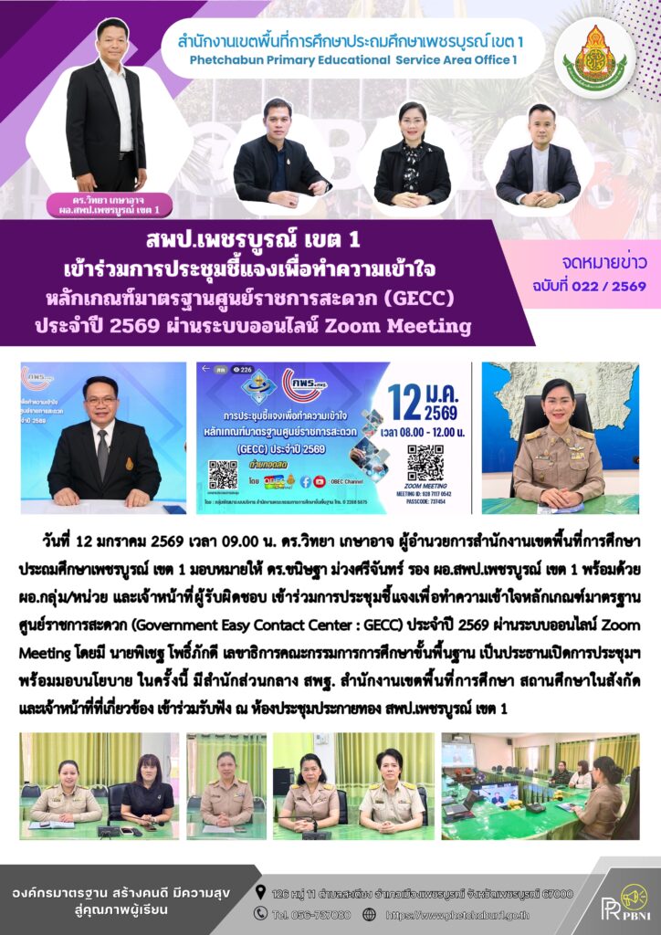 สพป.เพชรบูรณ์ เขต 1 เข้าร่วมการประชุมชี้แจงเพื่อทำความเข้าใจหลักเกณฑ์มาตรฐานศูนย์ราชการสะดวก (GECC) ประจำปี 2569By pinsherfa_dlct / January 12, 2026 Post Views: 1