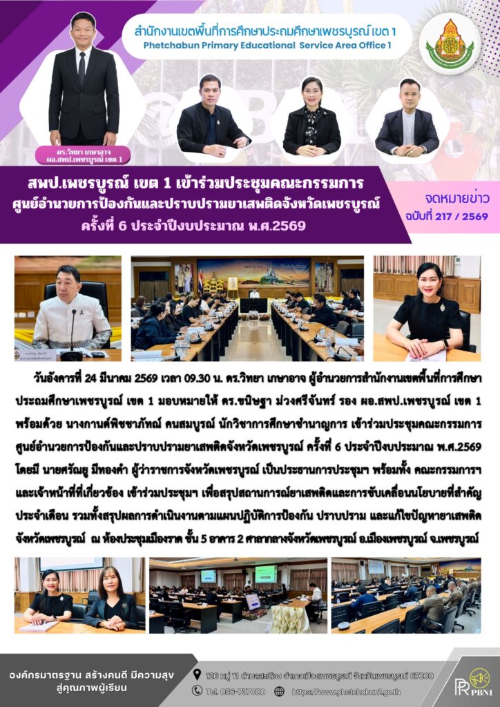 สพป.เพชรบูรณ์ เขต 1 เข้าร่วมประชุมคณะกรรมการศูนย์อำนยการป้องกันและปราบปรามยาเสพติดจังหวัดเพชรบูรณ์ ครั้งที่ 6 ประจำปีงบประมาณ พ.ศ. 2569By pinsherfa_dlct / March 24, 2026 Post Views: 3