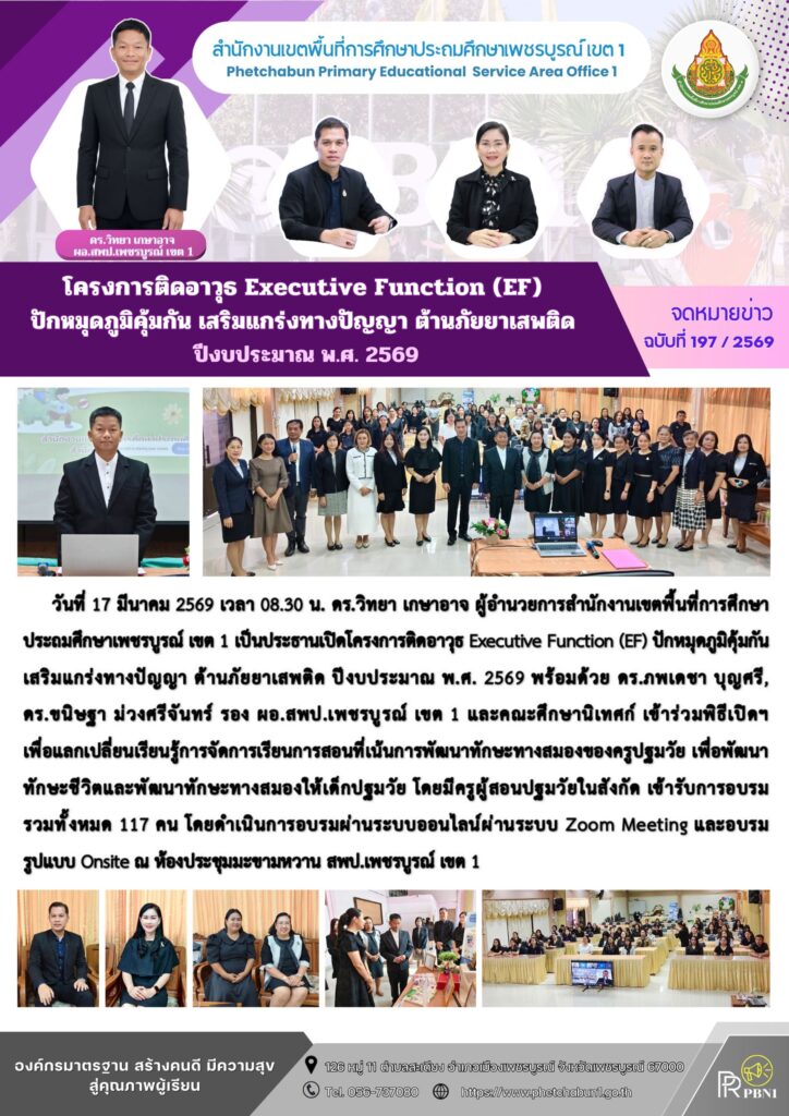 โครงการติดอาวุธ Executive Function (EF) ปักหมุดภูมิคุ้มกัน เสริมแกร่งทางปัญญา ต้านภัยยาเสพติด ปีงบประมาณ พ.ศ. 2569By pinsherfa_dlct / March 17, 2026 Post Views: 1