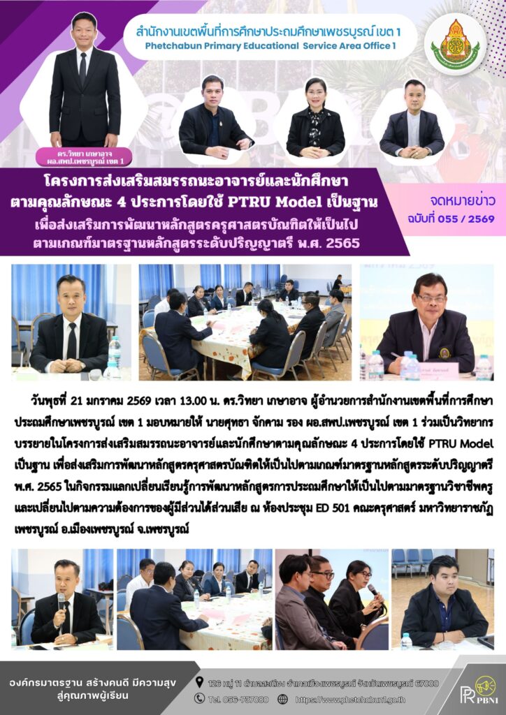 โครงการส่งเสริมสมรรถนะอาจารย์และนักศึกษาตามคุณลักษณะ 4 ประการ โดยใช้ PTRU Model เป็นฐาน เพื่อส่งเสริมการพัฒนาหลักสูตรครุศาสตร์บัณฑิตให้เป็นไปตามเกณฑ์มาตรฐาน หลักสูตรระดับปริญญาตรี พ.ศ. 2565By pinsherfa_dlct / January 21, 2026 Post Views: 1
